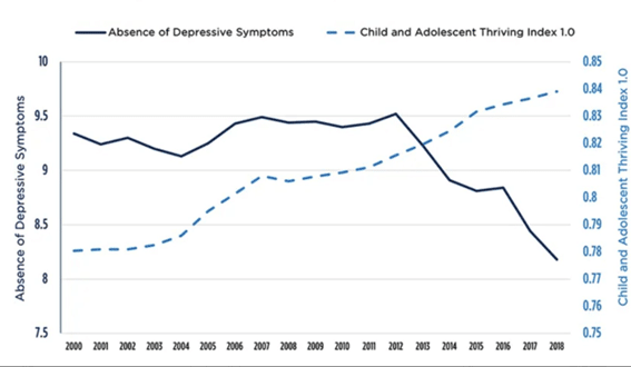 Notas: La ausencia de síntomas depresivos (eje vertical izquierdo) se codifica de modo que valores más altos indican un mejor resultado (1 = peor, 17 = mejor). Se construye a partir de cuatro preguntas (a los encuestados se les pide, en una escala de 1 a 5, cuánto están de acuerdo con las siguientes afirmaciones: “la vida a menudo no tiene sentido”, “el futuro a menudo parece desesperanzador”, “se siente bien estar vivo” y “disfruto la vida tanto como cualquiera”), provenientes del estudio Monitoring the Future, según cálculos realizados por Keyes y coautores. El Índice de Prosperidad Infantil y Adolescente 1.0 (eje vertical derecho) es un índice compuesto que va de 0 (peor) a 1 (mejor) y mide una combinación de factores relacionados con bienestar, incluyendo salud, educación, alimentación, estabilidad, riqueza y otros.