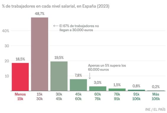 En el gráfico siguiente puedes ver la distribución de la población activa en España en los diferentes rangos salariales (brutos):