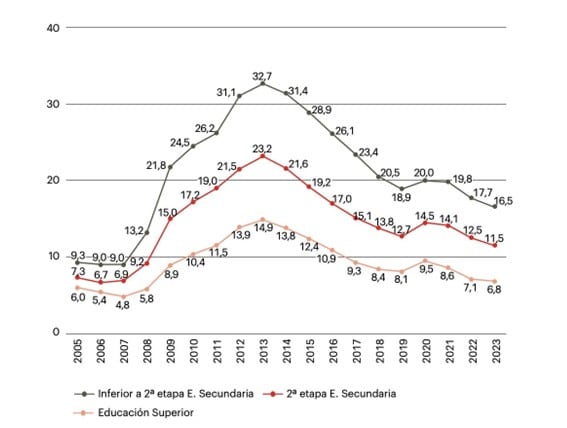 Tasa de paro por nivel de estudios, 25-64 años, 2005-2023