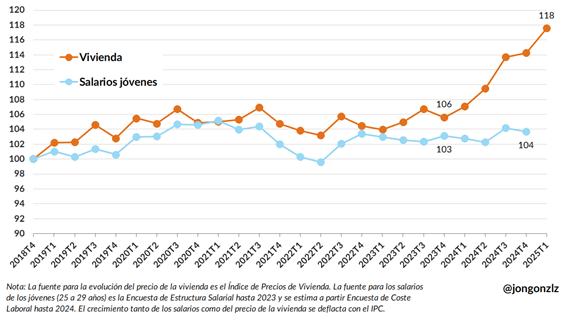 Crecimiento de salarios de los jóvenes y precios de vivienda en términos reales